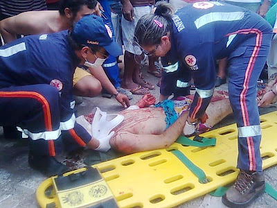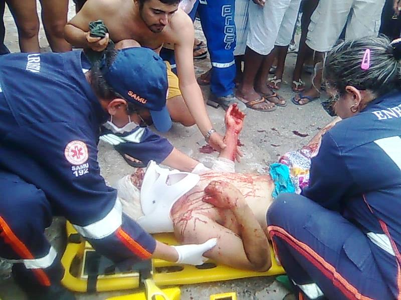 Os agentes de trânsitos chegaram ao local, fizeram o isolamento enquanto a equipe BRAVO-2 socorristas Soares e Magali do SAMU realizavam os primeiros atendimentos da vítima que teve politraumatismo, corte profunda na clavícula, orelha decepada e escoriações de arrasto. Ele foi conduzido em estado grave para o HRTM.